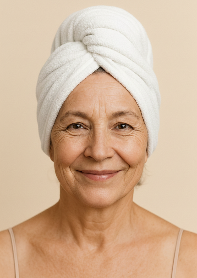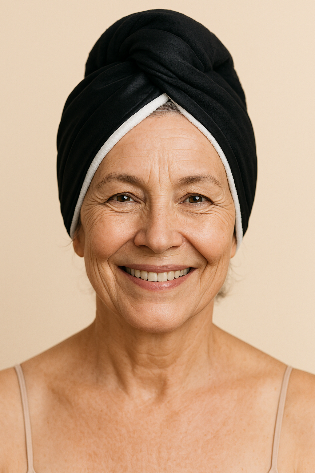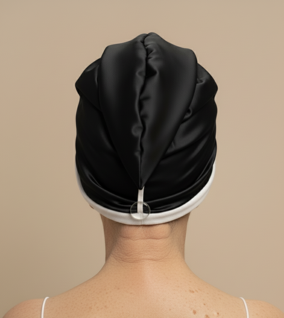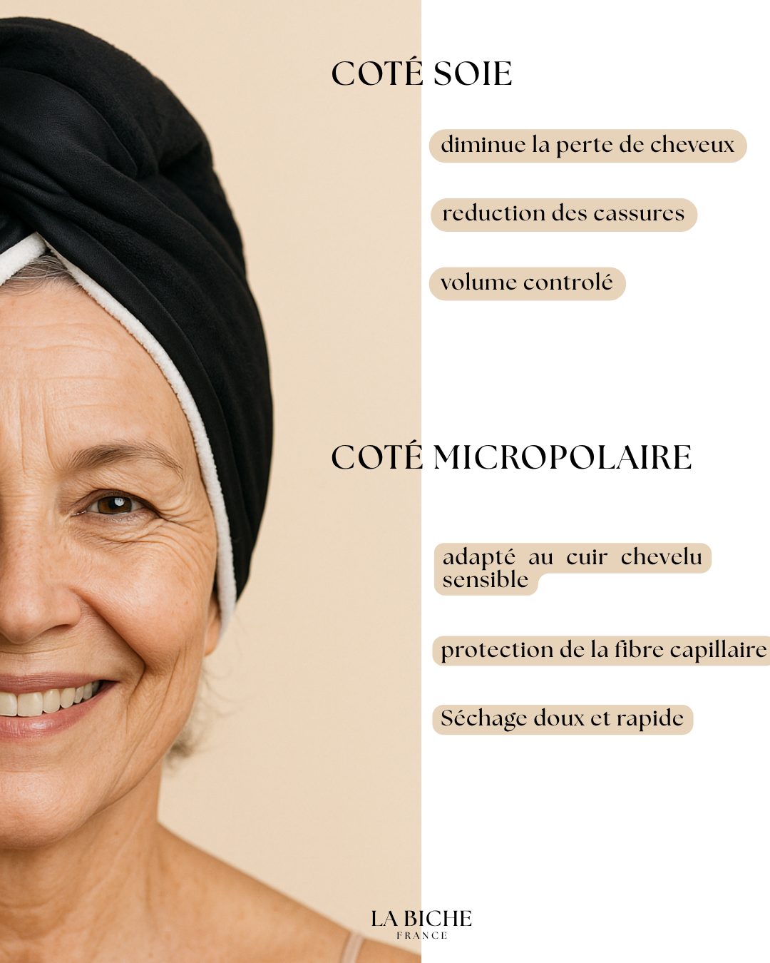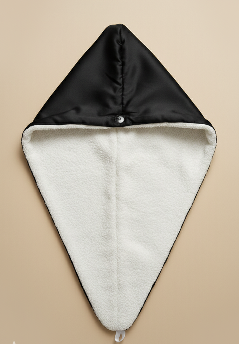 La serviette pour cheveux Virginie incarne l’élégance classique. Sa soie noire s’adapte à tous les styles et révèle une allure chic et discrète. Associée au blanc polaire, elle offre un contraste sobre et raffiné. Bimatière et pensée pour le soin des cheveux, elle limite les frisottis, préserve la fibre capillaire et sublime chaque routine beauté.